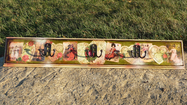 I modge podged some doilies, roses, and cool images onto a board and added hooks.